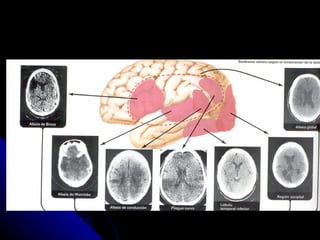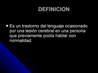 El documento describe diferentes tipos de afasia, trastornos del lenguaje causados por lesiones cerebrales. Define afasia como la pérdida parcial o total de la capacidad de comunicarse, ya sea por expresión o comprensión del lenguaje. Explica las áreas cerebrales asociadas con diferentes funciones del lenguaje y las localizaciones típicas de lesiones para cada tipo de afasia.