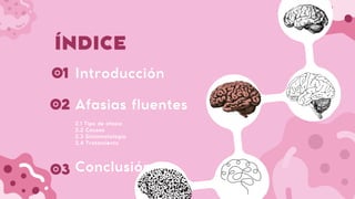 El documento presenta un análisis detallado de las afasias fluentes, incluyendo sus tipos, causas, sintomatología y tratamientos asociados. Se discuten específicamente afasia de Wernicke, afasia anómica, afasia de conducción y afasia transcortical, junto con sus características clínicas y enfoques terapéuticos. Se concluye que un diagnóstico y tratamiento oportuno son fundamentales para abordar estos trastornos del lenguaje.