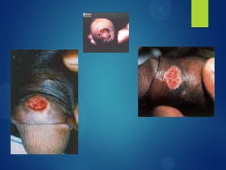 Este documento describe las principales afecciones del aparato reproductor masculino, incluyendo infecciones bacterianas, tuberculosis y sífilis. Detalla los agentes etiológicos, manifestaciones clínicas, diagnóstico y tratamiento de cada condición. La tuberculosis genitourinaria se presenta como cistitis recurrente, epididimitis subaguda o insuficiencia renal, y su diagnóstico requiere pruebas de laboratorio como cultivo de orina. La sífilis primaria causa un chancro indoloro que evoluciona a gangli