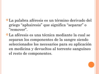 La aféresis es una técnica que separa los componentes de la sangre, extrayendo solo los necesarios y devolviendo el resto. Se usa para obtener componentes sanguíneos como plaquetas o células madre para transfusión o tratamiento de enfermedades. El proceso implica conectar al donante a una máquina que separa los componentes mediante centrifugación. Las células madre pueden obtenerse de médula ósea, sangre periférica o cordón umbilical, pero este último es la fuente más fácil y segura.