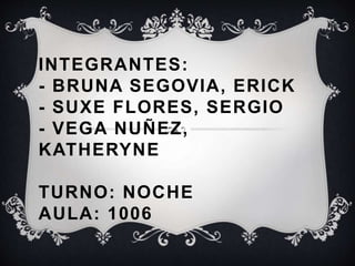 El documento lista 3 integrantes de un grupo - Bruna Segovia, Erick; Suxe Flores, Sergio; y Vega Nuñez, Kathetyne - para un turno nocturno en el aula 1006.