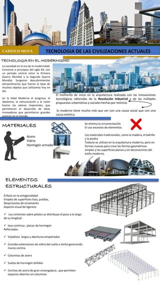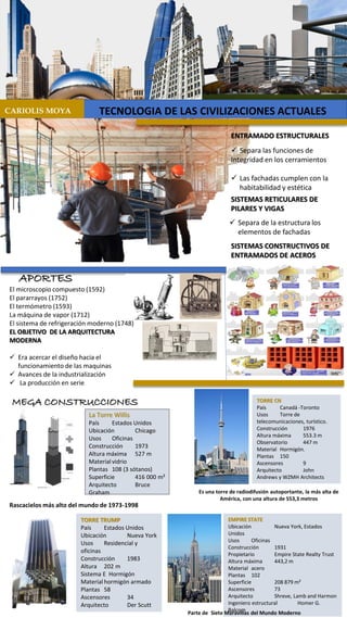 El documento describe la tecnología y arquitectura de las civilizaciones actuales. Explica que la era moderna comenzó en el siglo XX con grandes descubrimientos tecnológicos como el microscopio, el pararrayos y la máquina de vapor. Luego describe los materiales y elementos estructurales de la arquitectura moderna como el acero, el vidrio y el hormigón armado. Finalmente, analiza ejemplos de megaconstrucciones modernas como la Torre Willis y la Torre Trump, así como la arquitectura en Venezuela durante la época