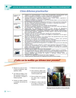 El documento proporciona recomendaciones sobre seguridad laboral e higiene industrial para los trabajadores de un centro de acopio avícola. Recomienda mantener orden y limpieza, conocer los riesgos laborales como caídas y choques, usar equipos de protección como guantes y cascos, y controlar agentes biológicos mediante buenas prácticas de higiene para prevenir infecciones. También incluye información sobre electricidad, señalización y normas de bioseguridad.