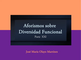 Este documento contiene 611 aforismos de José María Olayo Martínez sobre diversidad funcional. Cada aforismo presenta una breve reflexión o consejo relacionado con vivir con una discapacidad o promover la inclusión, como la importancia del humor, la optimismo, la realidad sobre la ficción, y evitar el victimismo o paternalismo.