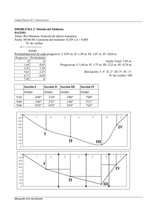 El documento presenta 3 problemas prácticos sobre aforos de ríos. El primero utiliza el método del flotador para medir el ancho, profundidad y tiempo de recorrido en un río. El segundo usa el método del molinete midiendo número de vueltas, profundidad y ancho en diferentes secciones. El tercero calcula el gasto medio diario a partir de curvas de altura/caudal y registros de altura en el tiempo.