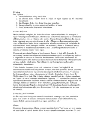 2) Los ejércitos islámicos conquistaron el norte de África en el siglo VII, extendiendo el Islam. En África occidental surgieron reinos como Ghana, Mali y Songhai que controlaron las rutas comerciales transaharianas.