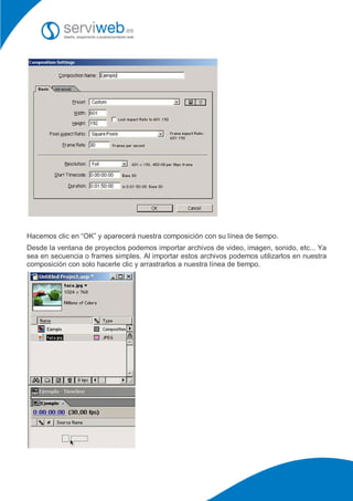 After Effects es un potente software de composición y post-producción de video que permite trabajar en capas y utilizar plug-ins para crear efectos visuales. El documento describe cómo iniciar un proyecto, importar archivos multimedia, y aplicar efectos y animaciones básicas para lograr composiciones dinámicas. Además, se menciona la importancia de la práctica y la experimentación para dominar sus herramientas y características avanzadas.