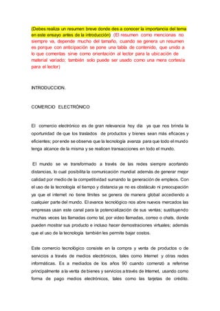 Este documento resume el tema del comercio electrónico en 3 oraciones. Explica que el comercio electrónico ha crecido rápidamente debido a Internet y ahora es una parte importante de las transacciones comerciales globales. Luego describe las cuatro categorías principales de comercio electrónico (compañía-compañía, compañía-cliente, compañía-gobierno, cliente-gobierno). Finalmente, resume brevemente los orígenes del comercio electrónico en la década de 1920 con la venta por catálogo y su evolución con la