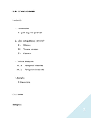 El documento discute el tema de la publicidad subliminal, definiendo qué es, sus orígenes y tipos, así como ejemplos de mensajes subliminales ocultos en imágenes publicitarias. También describe un experimento que buscó comprobar si los estímulos subliminales alimentarios afectan la sensación de hambre.