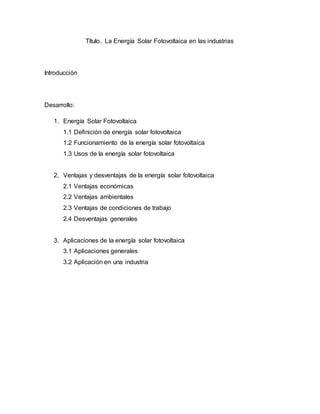 El documento trata sobre la energía solar fotovoltaica y sus aplicaciones en la industria. Explica que la energía solar fotovoltaica es una fuente renovable y limpia de energía que funciona convirtiendo la luz solar en electricidad. Detalla las ventajas económicas y ambientales de su uso, como la reducción de costos y emisiones contaminantes. Finalmente, señala que la energía solar fotovoltaica puede utilizarse para abastecer de energía eléctrica a la industria mediante el uso de paneles solares y tecn