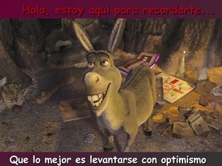 El documento ofrece consejos para empezar el día con una actitud positiva a pesar de tener que ir a trabajar, recomendando levantarse con optimismo, arreglarse, tomar un tonificante, sonreír, dar besos, abrazar a los amigos en el trabajo y desearles un maravilloso día.