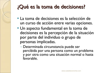 La toma de decisiones gerencial implica considerar múltiples factores y opciones. Existen decisiones programadas para situaciones recurrentes y decisiones no programadas para problemas imprevistos. El proceso de toma de decisiones incluye definir el problema, buscar información, evaluar alternativas y elegir la mejor opción considerando incertidumbre, riesgo y otros aspectos cualitativos. Las decisiones se pueden tomar individualmente o en grupo, donde se balancean ventajas como aportes diversos contra desventajas como más tiempo para decidir.