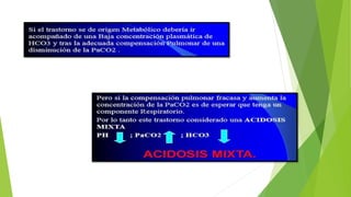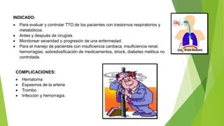La gasometría arterial mide parámetros importantes del equilibrio ácido-base y la oxigenación en la sangre arterial. Evalúa la presión parcial de oxígeno, dióxido de carbono, pH, y bicarbonato, entre otros, para diagnosticar trastornos respiratorios, metabólicos y de equilibrio ácido-base. Se toma una muestra de sangre arterial directamente o de un catéter arterial, midiendo valores normales y anormales que ayudan a guiar el tratamiento.