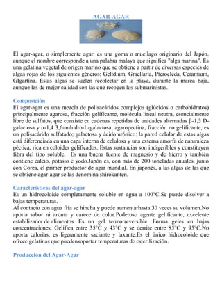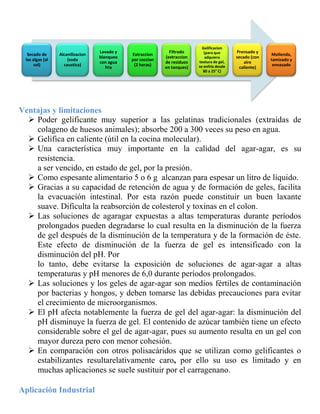 El agar-agar es una gelatina vegetal obtenida de algas marinas rojas que se utiliza como espesante y estabilizante alimentario. Se obtiene al hervir las algas, lavarlas y extraer los polisacáridos gelificantes como la agarosa. Forma geles termorreversibles entre 35°C y 43°C ideales para la industria alimentaria y farmacéutica.