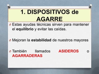 Los dispositivos de agarre como asideros, agarraderas y andadores sirven para mejorar la estabilidad y evitar caídas en personas mayores. Los asideros se colocan en diferentes zonas como el baño o para incorporarse y ofrecen puntos de apoyo. Los andadores se usan de forma similar a la marcha y también sirven como sillas o canastas. Los adaptadores de agarre ayudan a sujetar utensilios como bolígrafos o herramientas de forma segura.