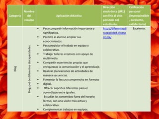 El documento lista varios recursos didácticos digitales como Google Drive, Blogspot, Google Maps, Wikispaces, Facebook, YouTube y Slideshare. Para cada recurso, describe brevemente sus aplicaciones didácticas potenciales y asigna una calificación personal.