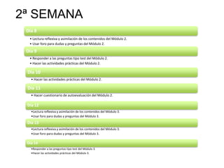El documento presenta el plan de estudios dividido en 6 semanas para completar 7 módulos de contenido. Cada semana, los estudiantes leerán los materiales de aprendizaje, participarán en foros de discusión, completarán pruebas y actividades prácticas, y realizarán autoevaluaciones para cada módulo. Al final del curso, los estudiantes completarán un proyecto final y proporcionarán comentarios sobre su experiencia en el curso.