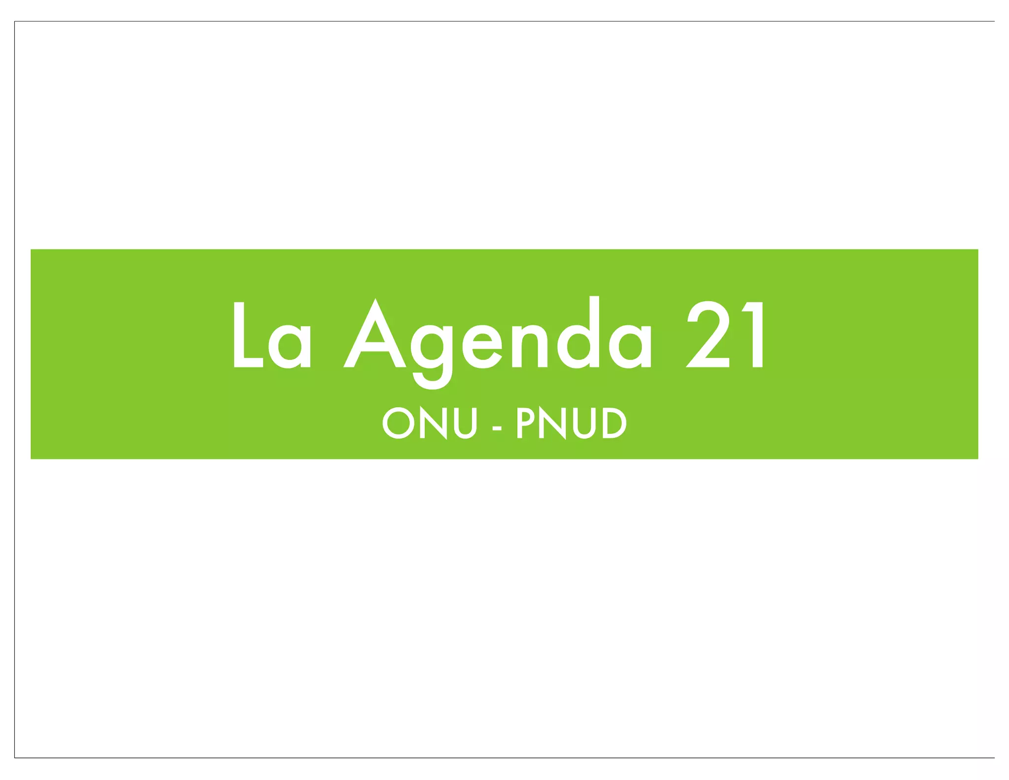 La Agenda 21 es un plan de acción de las Naciones Unidas para promover el desarrollo sostenible a nivel mundial, nacional y local. Se creó en 1992 en la Cumbre de la Tierra de Río de Janeiro y contiene recomendaciones para la conservación del medio ambiente y los recursos naturales en áreas como agricultura, salud, biodiversidad y gestión de desechos. El documento analiza la historia de la sostenibilidad desde la década de 1960 y explica la estructura y objetivos de la Agenda 21.