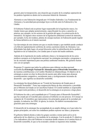 El documento presenta la Estrategia Nacional de Alemania para el Desarrollo Sostenible. El resumen describe que la estrategia fue desarrollada por un comité interministerial para establecer objetivos como duplicar la eficiencia energética y aumentar la cuota de energías renovables. La estrategia incluye 21 objetivos e indicadores clave y 8 áreas de acción para lograr el desarrollo sostenible en Alemania.