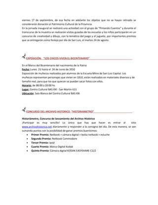 El documento resume varios eventos culturales que tendrán lugar en la provincia de San Luis, Argentina, en el marco del Bicentenario de la Revolución de Mayo, incluyendo exposiciones, concursos, presentaciones musicales y más.