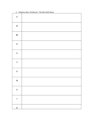 Este documento presenta la agenda para una clase sobre currículo en el primer ciclo de educación básica. La agenda incluye discusiones sobre competencias en el nivel básico, proyectos de integración curricular, y una revisión de materiales de texto utilizados en el país. Los estudiantes también reciben asignaciones para investigar sobre la revisión curricular actual y presentar títulos de libros relacionados al tema de currículo.