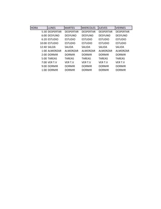 El documento presenta un horario semanal típico que incluye despertar temprano, estudiar por la mañana, almorzar, hacer tareas por la tarde y dormir temprano durante la semana, mientras que los fines de semana se dedican más al descanso y actividades de ocio.