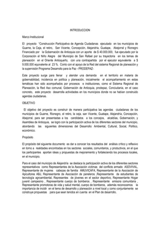 Este documento presenta la Agenda Ciudadana del municipio de Alejandría, Antioquia. Resume los resultados de un proceso participativo con diversos sectores de la comunidad para identificar necesidades y proponer soluciones en cinco dimensiones: social, económica, ambiental, cultural y política. Incluye una visión para cada dimensión y propone objetivos y estrategias basadas en los aportes ciudadanos para ser consideradas en el Plan de Desarrollo Municipal.