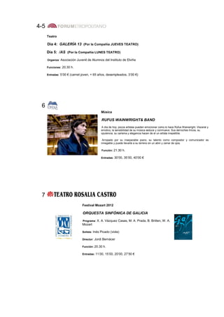 El documento proporciona una agenda cultural para el mes de junio en La Coruña, España. Incluye eventos de teatro, música, danza, cine, exposiciones y más. Los eventos están organizados por fecha e incluyen detalles como el lugar, hora, artistas o compañías involucradas, programa, entradas y contacto.
