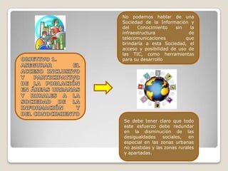 El documento describe los objetivos de la Agenda Digital 2.0 para aplicar las tecnologías de la información y la comunicación (TIC) en Perú. Los objetivos incluyen expandir el acceso a las TIC, desarrollar competencias digitales, impulsar la investigación e innovación sobre TIC, e incrementar la productividad y competitividad a través de la innovación digital. Se enfatiza la importancia de reducir las desigualdades sociales y apoyar el desarrollo de la industria nacional de TIC.