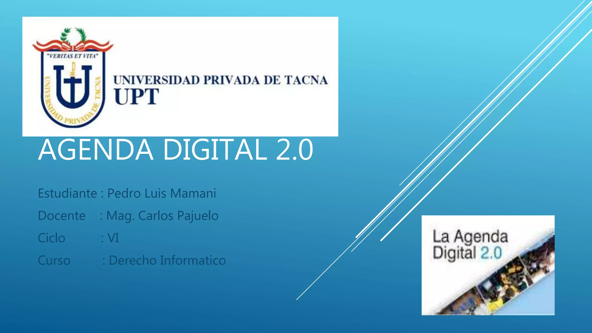 El documento presenta la Agenda Digital 2.0, la cual tiene como objetivo promover el uso de las tecnologías de la información y la comunicación (TIC) en Perú para mejorar la productividad, calidad de vida y desarrollo humano. La agenda se basa en 8 objetivos principales, incluyendo asegurar el acceso inclusivo a la sociedad de la información, integrar competencias digitales en la población, fomentar la investigación e innovación sobre TIC, incrementar la productividad a través de la innovación digital, y lograr que los line