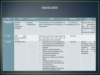 El documento describe planes nacionales de tecnologías de la información y comunicación (TIC) en varios países de América Latina y España. Los planes tienen el objetivo general de promover el uso de las TIC para impulsar la educación, gobierno, economía y sociedad a través de mejor acceso a Internet y eventos informativos sobre nuevas tecnologías.