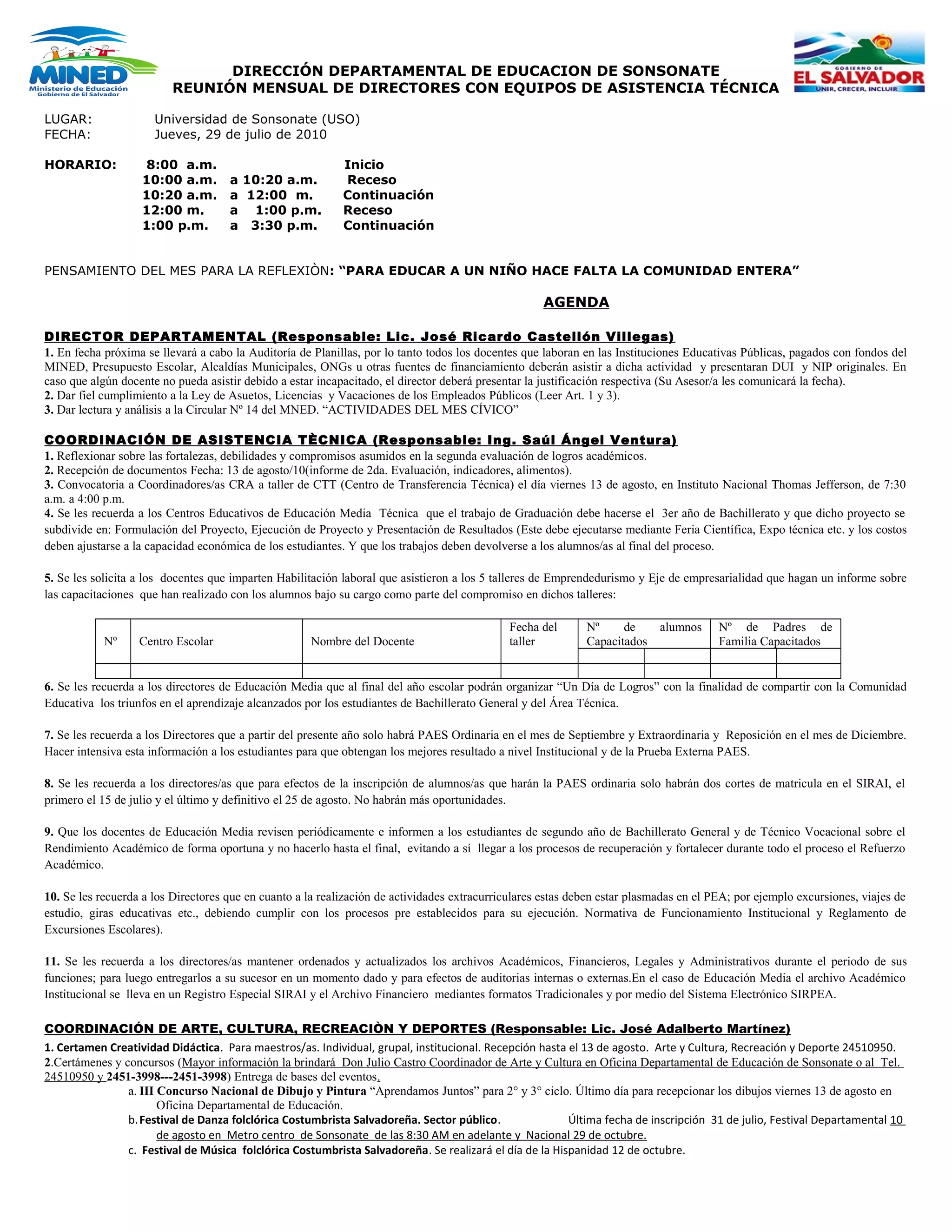 Este documento presenta la agenda para una reunión mensual de directores y equipos de asistencia técnica del departamento de educación de Sonsonate. La agenda incluye puntos sobre auditorías de planillas de docentes, cumplimiento de leyes laborales, actividades del mes cívico, evaluaciones de logros académicos, certámenes culturales y deportivos, y recordatorios sobre procesos y plazos administrativos.