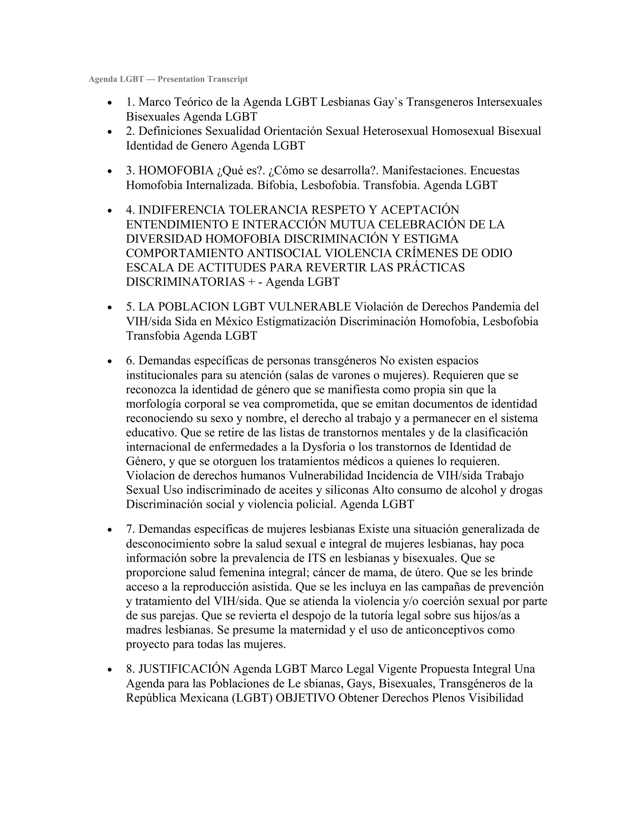 El documento presenta una agenda para promover los derechos de las personas LGBT en México. Propone reformas constitucionales para prohibir la discriminación por orientación sexual e identidad de género, implementar educación sobre la sexualidad, y reconocer la diversidad de familias. También aboga por reformas legales que otorguen a parejas del mismo sexo acceso a beneficios de salud y pensiones del gobierno. El objetivo general es lograr la igualdad de derechos y visibilidad de la comunidad LGBT a través de cambios en las leyes y políticas de México