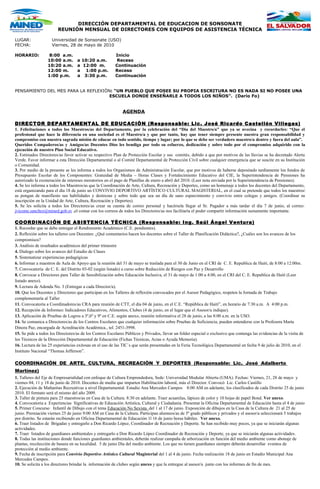 La reunión mensual de directores y equipos de asistencia técnica en la Universidad de Sonsonate incluyó puntos sobre protección escolar ante lluvias, pagos de planillas docentes, y eventos culturales, deportivos y artísticos magisteriales. También se discutieron temas de planificación educativa, rendimiento académico, uso de tecnologías de información y comunicación, y procesos relacionados a paquetes escolares.