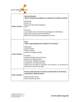 El documento describe el programa de un evento titulado "PerspecTIvas: Construyendo el Futuro del Clúster" que se llevará a cabo el 18 de febrero de 2014 en el Salón eJalisco en Guadalajara. La agenda incluye una conferencia sobre la estrategia PROSOFT 3.0 del gobierno federal para impulsar las tecnologías de la información en México, un panel sobre tendencias tecnológicas macro y su impacto, y un panel sobre los retos y oportunidades para el clúster de TI de Jalisco, con