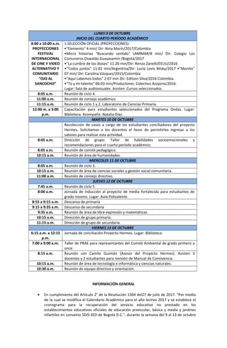 Este documento presenta la programación semanal del Colegio María Mercedes Carranza para la semana del 9 al 13 de octubre. Incluye los horarios de acompañamiento de los estudiantes, las reuniones docentes programadas, actividades como un festival de cine y talleres, e información general sobre el calendario académico y funcionamiento del comedor escolar.