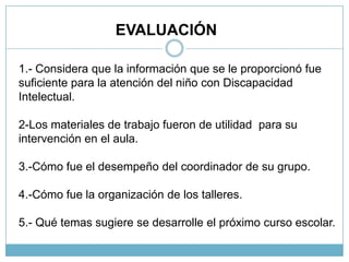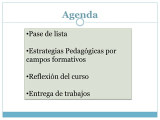 La sesión 10 del curso presentó una agenda que incluyó el pase de lista, discusiones sobre estrategias pedagógicas por campos formativos, reflexiones sobre el curso y entrega de trabajos. Al final, se pidió una evaluación del curso a través de 5 preguntas sobre la información y materiales proporcionados, el desempeño del coordinador del grupo, la organización de los talleres y temas sugeridos para el próximo curso escolar.