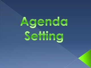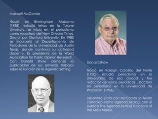 1) El documento presenta información biográfica de varios académicos e investigadores clave en el desarrollo de la teoría de la agenda setting, incluyendo a Maxwell McCombs, Donald Shaw, Walter Lippman y Bernard Cohen. 2) Se describen conceptos fundamentales como la teoría de los efectos, la sociedad de masas y la investigación pionera de McCombs y Shaw sobre la influencia de la cobertura mediática en la opinión pública. 3) También se explican los diferentes tipos de agendas (de los medios, del público y