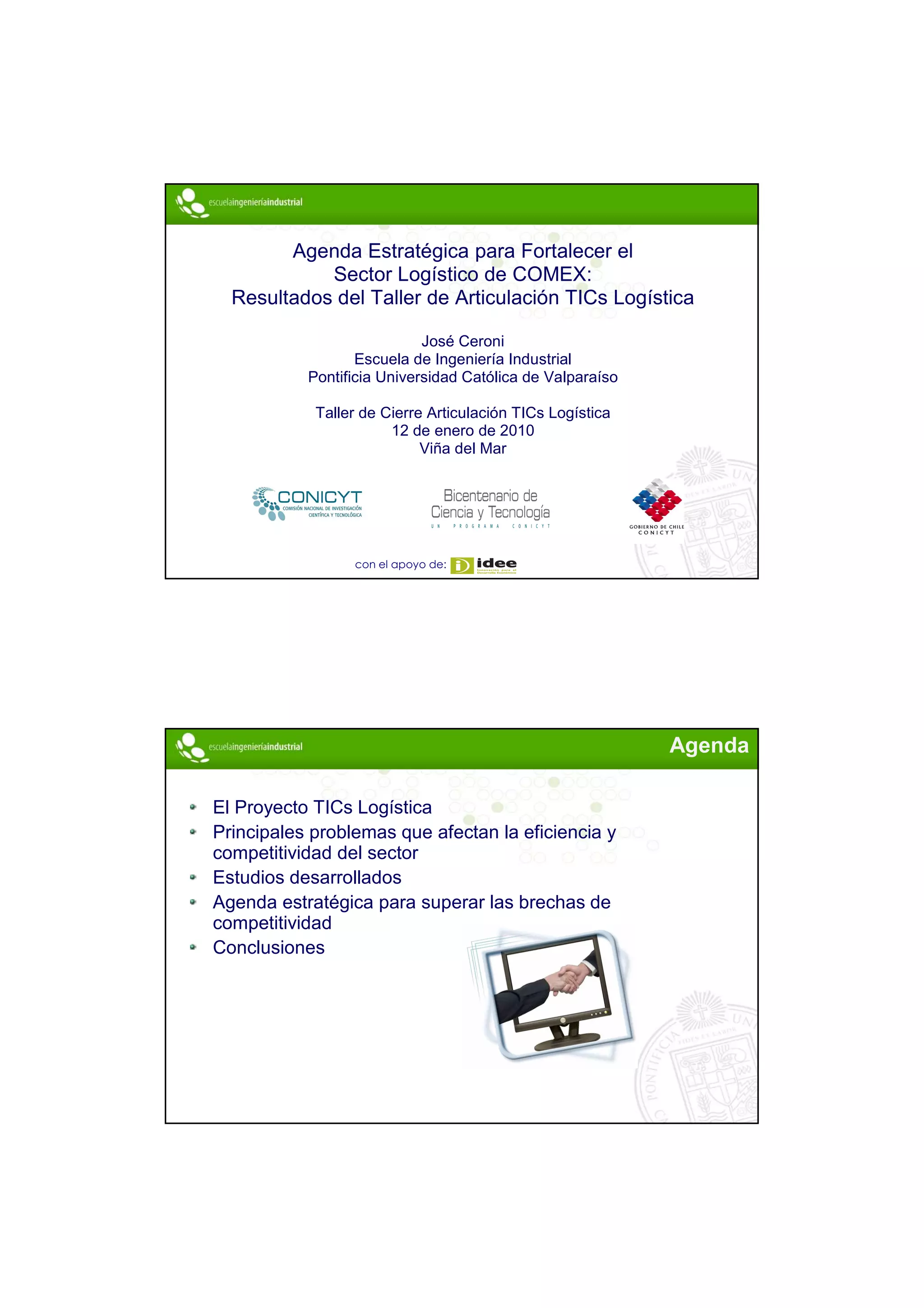 El documento presenta la agenda estratégica del proyecto TICS Logística, que busca mejorar la competitividad del sector logístico de comercio exterior en Chile a través de la articulación entre universidades, empresas y organismos públicos. Se identifican problemas clave que afectan la eficiencia del sector, como la deficiente gestión de información y la falta de visibilidad en la carga, y se proponen iniciativas prioritarias para abordar estas brechas, incluyendo la creación de un observatorio logístico y un sistema piloto de gestión documental. Las conclusiones subrayan la importancia de las tecnologías de la información y la cooperación público-privada para fortalecer el sector y mejorar su competitividad en el ámbito internacional.
