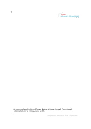 Este documento presenta la Agenda de Innovación y Competitividad 2010-2020 elaborada por el Consejo Nacional de Innovación para la Competitividad. La agenda propone fortalecer tres pilares para aumentar la innovación empresarial y la productividad en Chile: 1) aumentar la innovación en las empresas chilenas acercándolas a la frontera tecnológica, 2) fortalecer la ciencia y la tecnología para apoyar la innovación empresarial, y 3) mejorar el capital humano. El objetivo es que la innovación impulse