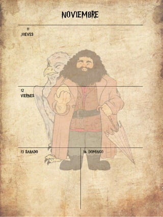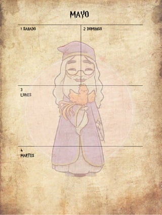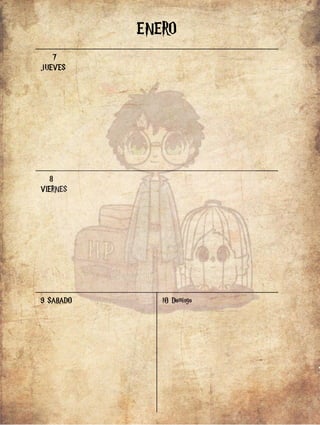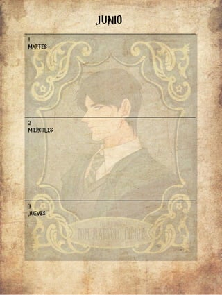 El documento contiene varios calendarios mensuales con días de la semana y fechas. También incluye tablas con nombres, teléfonos, indicaciones médicas y observaciones. Por último, presenta formatos para el seguimiento de hábitos y tareas profesionales y personales.