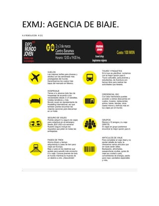 EXMJ es una agencia de viajes que ofrece los mejores precios para vuelos, tours, hospedaje, seguros de viaje y artículos para viajeros jóvenes y adultos. Proporcionan opciones culturales, de aventura y estudiantiles en México y el extranjero, así como membresías ISIC que ofrecen descuentos. También organizan viajes gratuitos para grupos de 10 personas o más.