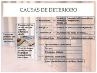 Este documento trata sobre las causas de deterioro del patrimonio documental, incluyendo factores químicos, ambientales, biológicos y antropogénicos. Explica la importancia de estudiar estas causas para entender el comportamiento de los documentos y preservarlos a través del tiempo. También discute medidas para controlar factores ambientales como la temperatura, humedad y luz, así como agentes biológicos como hongos e insectos.