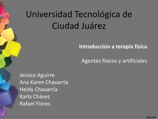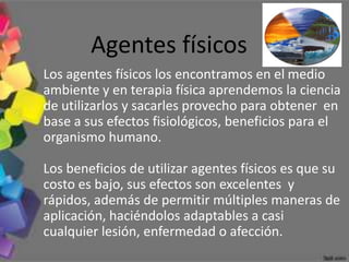 Este documento proporciona una introducción a los agentes físicos y artificiales utilizados en terapia física. Describe los diferentes tipos de agentes físicos como calor, frío, agua y sonido, y explica sus efectos fisiológicos. También cubre agentes artificiales como la electricidad, la luz y el láser, y cómo se usan en aplicaciones como electroterapia, fototerapia y terapia láser.