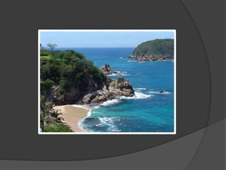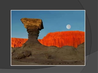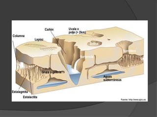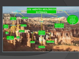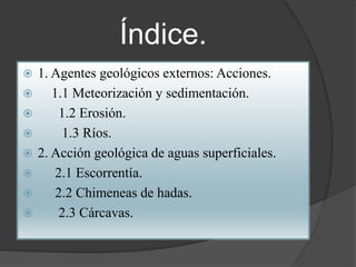 Este documento describe los principales agentes geológicos externos y sus acciones sobre la litosfera. Explica la meteorización, erosión, sedimentación causadas por el agua superficial y subterránea, hielo, viento y mar, y cómo forman características del relieve como ríos, cárcavas, glaciares, dunas, bahías y cabos.