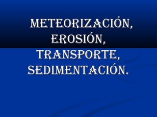 Este documento describe los principales procesos geológicos externos como la meteorización, erosión, transporte y sedimentación. Explica los diferentes tipos de meteorización física, química y biológica y cómo afectan a las rocas. También describe los distintos tipos de erosión como la eólica y del agua, así como los mecanismos de transporte por viento y agua. Por último, define la sedimentación y cómo se forman las rocas sedimentarias a través de la compactación y cementación.