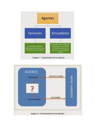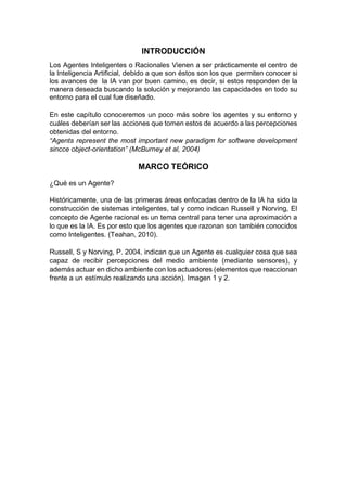 Este documento introduce el concepto de agentes inteligentes en inteligencia artificial. Explica que un agente es cualquier entidad que puede percibir su entorno a través de sensores y actuar sobre él a través de actuadores. Describe que los agentes reciben percepciones, las procesan y luego toman acciones basadas en esas percepciones para interactuar con el entorno.