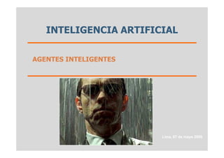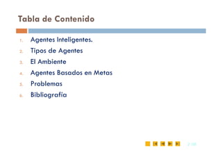 El documento aborda los conceptos fundamentales de agentes inteligentes, describiendo su definición, estructura y tipos, como los agentes reflejo simples, con estado interno, basados en metas y basados en utilidad. También se analiza la relación entre agentes y su ambiente, así como la formulación y solución de problemas de búsqueda. Finalmente, se detalla el proceso de diseño de un agente para la resolución de problemas complejos.
