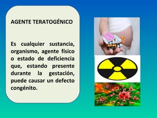 Este documento describe los agentes teratogénicos, que son sustancias que pueden causar defectos congénitos cuando están presentes durante el embarazo. Define defectos congénicos y enumera algunos de los primeros agentes teratogénicos identificados como la radiación, el virus de la rubéola y la talidomida. Luego describe varios tipos de agentes teratogénicos como medicamentos, enfermedades maternas, infecciones, radiaciones y sustancias químicas. Finalmente, explica cómo actúan los agentes teratog