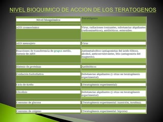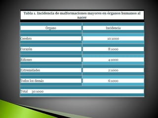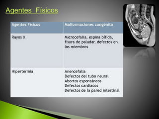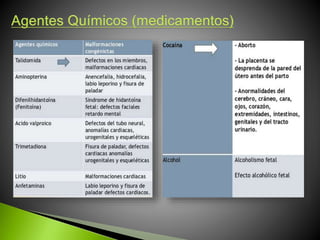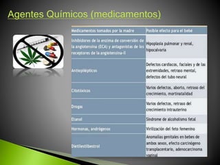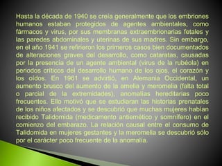 1) Hasta la década de 1940 se creía que los embriones estaban protegidos de agentes ambientales, pero en 1941 se reportaron casos de defectos congénitos causados por el virus de la rubéola durante periodos críticos del desarrollo. 2) En 1961 se descubrió que el consumo de talidomida por mujeres embarazadas causaba defectos en los extremidades de los bebés. 3) Se ha descubierto que muchos agentes ambientales como medicamentos, virus, radiación y temperatura elevada pueden causar alteraciones en el desarrollo embrion